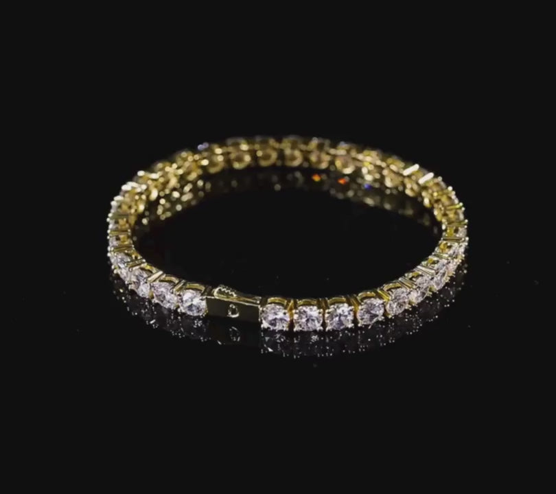 Defined by a continuous line of brilliance, this tennis bracelet is constructed from 925 Sterling Silver and plated in 18k Gold. It features a series of 5mm round-cut moissanite stones, each held by four distinct prongs to maximize light exposure and stability. The flexible link design is secured with a robust box clasp and safety latch, offering a comfortable and tailored fit for everyday elegance.